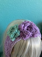 Pretty lilac, sea and cream colored cotton threads, crochet together, makes for a very fun headwear.