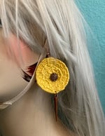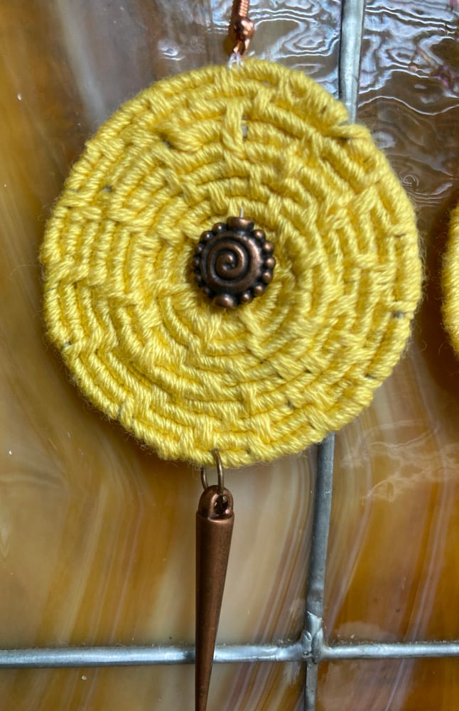 Made with organic hemp, wound with cotton threads in golden yellow. These are adorned with copper fancies with copper French ear hooks.