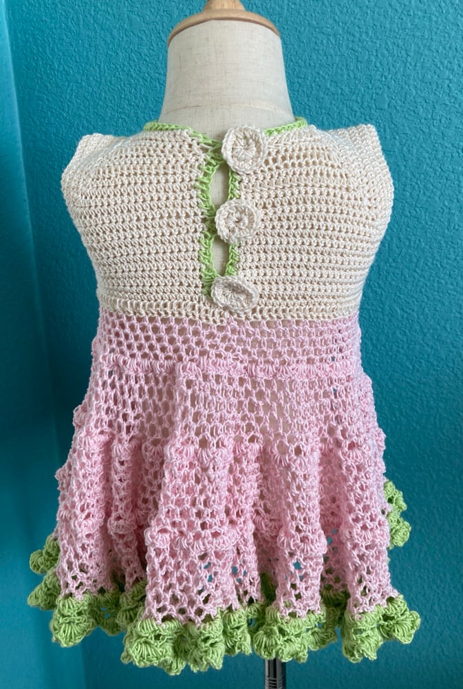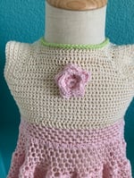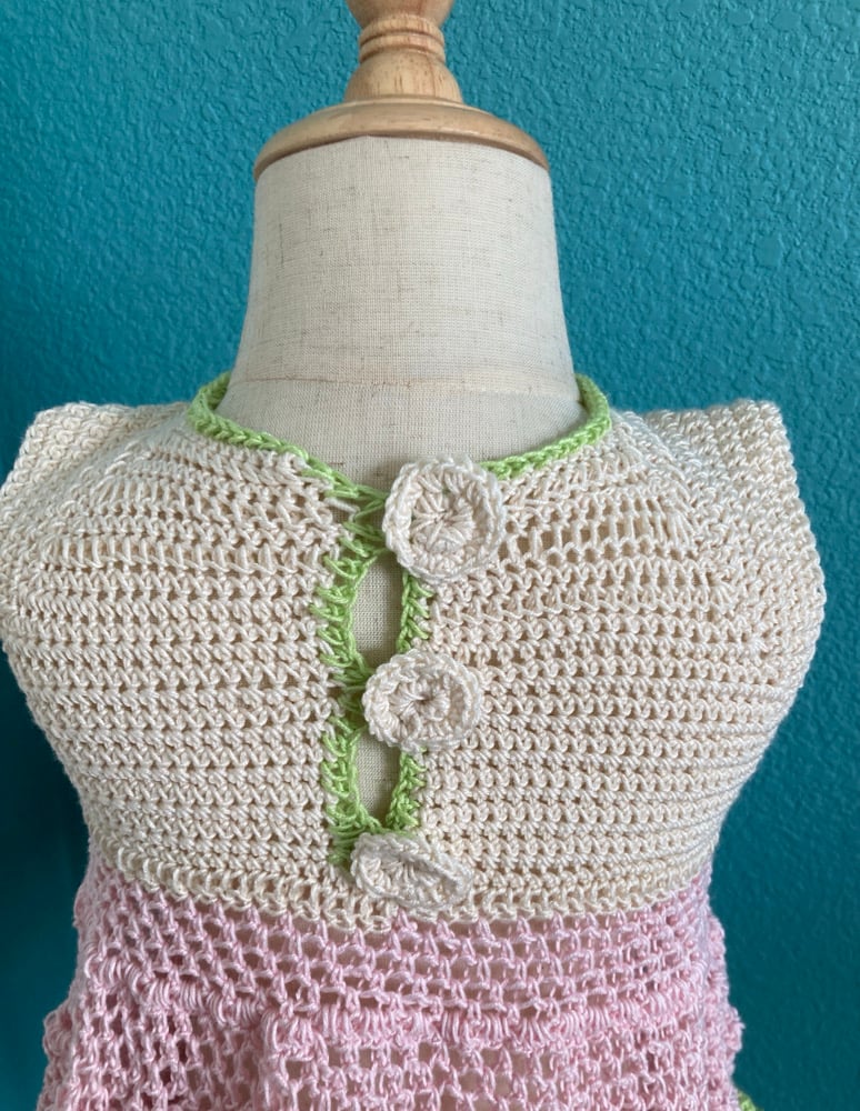 Pretty in pinks, creams and green, this handmade crochet lacey dress is so stink’n cute.